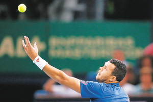 10月30日,在巴黎网球大师赛男单第二轮比赛中,法国选手特松加以2:1战胜同胞贝内托,晋级16强。图为特松加在比赛中发球。 新华社发