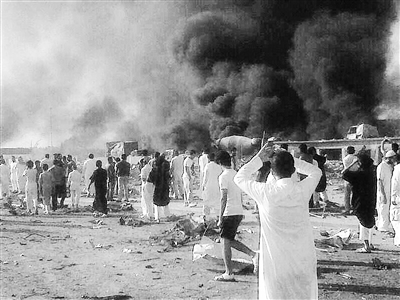 11月1日,沙特阿拉伯首都利雅得东部气罐车爆炸事故现场浓烟滚滚。