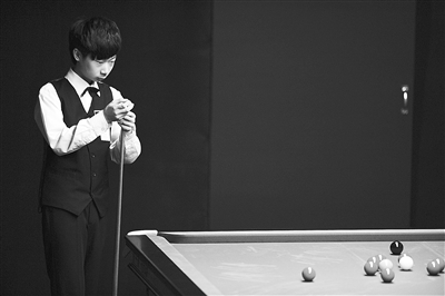 11月1日,在成都举办的2012斯诺克国际锦标赛中,中国14岁小将吕昊天以2:6不敌罗伯逊,无缘4强。图为吕昊天在比赛中。 新华社发