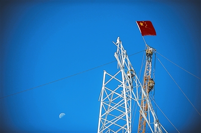 当日,国家电网的高空作业人员在巴颜喀拉山口,为国家电网玉树电网与青海主网330千伏联网工程第1237号铁塔安装上最后一组塔材。这是该工程全线海拔最高的一基铁塔。该塔的成功组立,标志着大电网向玉树地区输送光明指日可待。