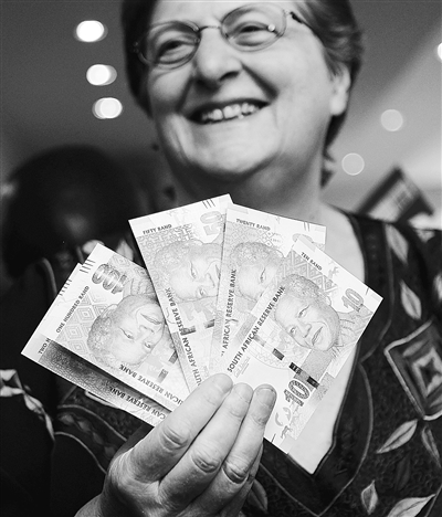 当日,南非政府发行的印有第一位民选总统曼德拉头像的纸币开始正式流通。新纸币正面印有曼德拉头像,背面印有非洲著名的5大动物(狮、豹、象、犀牛和野牛)。 新华社/路透