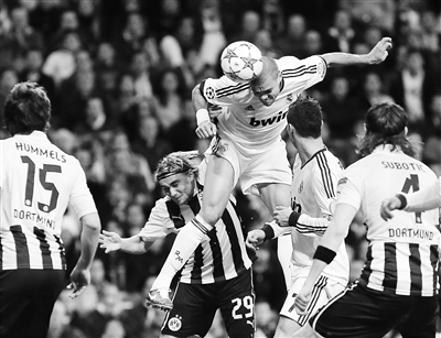 在欧冠联赛中,皇马主场以2:2战平多特蒙德队。图为皇马队球员佩佩(上)头球攻门得分。 新华社发