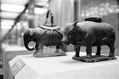 尤其是元代的一件灰陶象尊和一件灰陶牛尊,神态稚拙、古朴自然,表现出鲜明的风格印记。其实,在它们背后还有一段曲折的故事。据国家文物局专家研究发现,在这两件尊底部有“寄寄老人”的题款,他是一位宋末元初知名的工艺大师,尤以制作砚台出名,酷爱诗歌,常以自己制作的砚台换取当地文人的诗作,并结集刊印。而这两件陶塑,就是目前发现的他唯一的作品。
