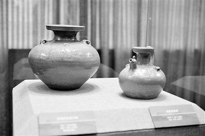 从此以后,中华陶瓷文明开始进入瓷器时代。一件西晋青瓷四系壶和一件东晋青釉鸡首壶散发着美丽的青色光辉。章佩岚介绍,我国自古有“南青北白”之说,古人认为青瓷类玉,格外喜爱。这两件青瓷表明,我国早在晋代甚至更早,就已经有了成熟的施釉工艺,这在陶瓷发展史上极为重要。也因此,这两件青瓷都属于国家一级文物。