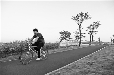 随着滨江带状公园项目的稳步推进,滨海西路绿色慢行系统景观工程陆续完工并启用。图为11月7日一位居民在绿道上骑行。据悉,整个慢行系统包括人行道、自行车道、绿化景观带以及照明工程、驿站、广场等休闲设施。