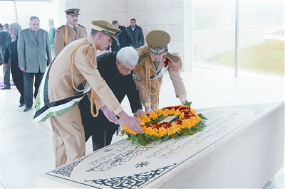 11月11日,在约旦河西岸城市拉姆安拉,巴勒斯坦民族权力机构主席阿巴斯(中)给阿拉法特墓敬献花圈。