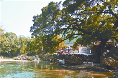 了一抹新意。商业化后的店铺与阳朔、丽江等那些古镇相比说不上特色,但因店家依然淳朴,所以也让人倍感亲切。古老朴实的建筑群总能让人眼前一亮,那随处可见的老树,见证着黄姚古镇千年历史的沧桑。
