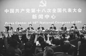 11月11日,十八大新闻中心举办主题为“中国银行改革与科学发展”的集体采访活动。中国人民银行行长、党委书记周小川(左四),中国银监会主席、党委书记尚福林(右四),中国工商银行董事长、党委书记姜建清(左三),中国农业银行董事长、党委书记蒋超良(右三),中国银行董事长、党委书记肖钢(左二),中国建设银行董事长、党委书记王洪章(右二)接受采访。