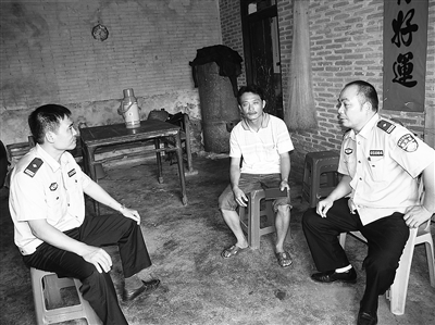 北大派出所所长蔡亚忠在黎苗山区呆了整整18年,从普通民警干到所长。常年在深山村寨里打转,他的脸晒得很黑,不穿警服时就像山里的村民。“我和山里村民打成一片,群众都信任我。”