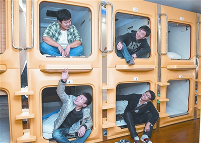 近日,重庆首家以“胶囊饭店”为卖点的迷你酒店成为前来重庆出差、旅游等外地旅行者的新选择。在一间不到20平方米的房间里整齐地放置着上下两层,共10个像太空舱一样的迷你“房间”。这些“房间”里面的设施可谓一应俱全,电视、挂钩,枕头、被子和床单干净整洁。而在公共空间里,厨房设施、洗衣机和无线网络等服务也都免费为客人提供。