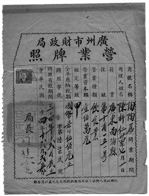 广州市送来的精品档案中,有一件民国三十四年(1945年)国民政府广州市财政局颁发给“陶陶居”的营业牌照。此为日本投降、广州光复后,广州国民政府恢复经济核发证照举措。