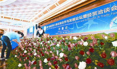 11月26日,海南国际会展中心,第八届泛珠大会开幕式台前,工作人员用鲜花布置会场。 本报记者 李英挺 摄