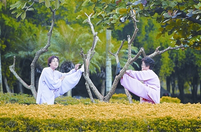 中图: 近日,海口市金盘路,两名晨练者把树当成了健身器材。