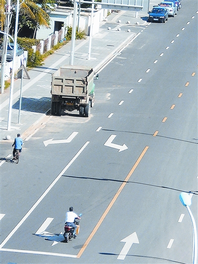 下图:近日,海口市碧海大道海甸二东路口,一辆货车、一辆自行车、一辆电单车一齐逆行。