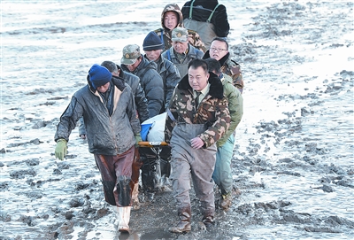 11月28日,在辽宁省大连市金州新区杏树屯猴石渔港,救援人员抬着一名遇难者的遗体走向岸边。当日凌晨,大连金州新区附近一渔船翻船沉没,船上17人只有1人获救,其他16人失踪。截至发稿,已打捞出12具遗体,目前有关方面正在搜救。 新华社发