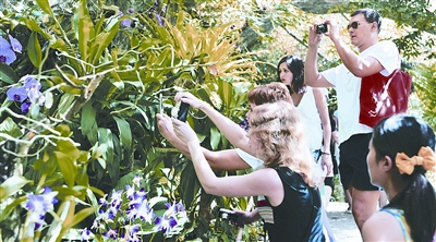 12月4日,一批俄罗斯游客在三亚亚龙湾热带天堂森林公园兰花谷拍摄芬芳馥郁的热带兰花。