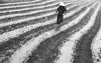 12月4日,海口市云龙镇田洋,一位菜农冒雨为刚出苗的辣椒喷洒农药,当前瓜菜的田间管理,预防阴雨天气造成的病虫害。
