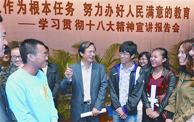 胡光辉是在海南省师范院校学习贯彻十八大精神宣讲会和座谈会上讲这番话的,他就十八大报告中提出的“把立德树人作为教育的根本任务”,与海南师范大学、琼台师范高等专科学校的师生代表一起进行了深入的交流探讨。