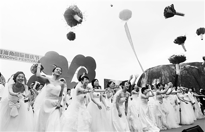 上午10时,来自世界各地的80对佳偶在天涯海角石旁举行盛大的集体婚礼。伴随着婚礼进行曲的音乐,80对新人逐一在婚礼现场亮相,共同接受人们的美好祝愿。婚礼现场,新人们互送槟榔、行夫妻礼、幸福接吻,共同许下“爱你到天涯,陪你到海角”的浪漫承诺。