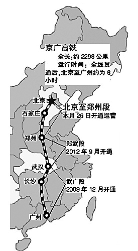 京广高铁是中国《中长期铁路网规划》中“四纵四横”高速铁路的重要“一纵”,北起北京,经石家庄、郑州、武汉、长沙,南至广州,全线设计时速350公里,初期运营时速300公里。