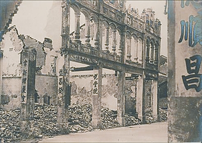 “谁愿意毁了自己的家园?谁愿意背井离乡?可是日本人的铁蹄已经踏进自己的家门,岛上几千国军无力抵抗,早早就退到了深山老林。新民街商人不愿意给日军留下完整的房子,他们亲手烧了自己的商铺,毁了自己的生意,纷纷逃难去了。”嘉积老华侨林唐山对记者说。今年85岁的林老先生,谈起当年情景,依然愤慨在胸。他说,日本入侵前,嘉积是海南第二大城市,600多栋的骑楼,各式的雕花,漂亮的女儿墙,青石铺成的街道,在新民街上显得十分典雅壮观。图片上清晰可见的“顺昌”、“益昌”等字号,都是嘉积镇上的老牌子。那时,家家有经营,户户有南洋客,商业较为发达,是海南东部重镇。到了1942年,嘉积商人早已经弃城而走,纷纷躲避到乡下或者辗转去了南洋。