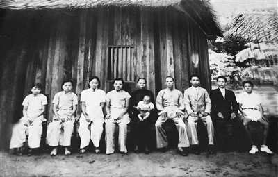 在谭月影老屋的墙壁上,挂着一张泛白的老照片。这是谭月影刚到马来西亚丁加奴橡胶园时,为了庆祝新婚而拍摄的“全家福”。照片中左边第二位,留着齐耳短发的年轻姑娘是谭月影,与右边第一位身着短衣短裤的丈夫,隔着好远端坐着。
