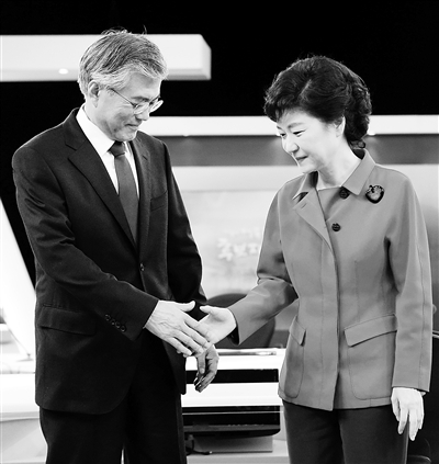12月16日,在韩国首尔,韩国新国家党总统候选人朴槿惠(右)和民主统合党总统候选人文在寅在电视辩论前握手。