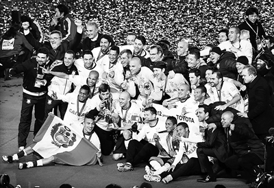 12月16日,在日本横滨进行的2012世界俱乐部锦标赛决赛中,科林蒂安队以1比0战胜切尔西队,夺得冠军。图为科林蒂安队球员在颁奖仪式上庆祝。新华社发