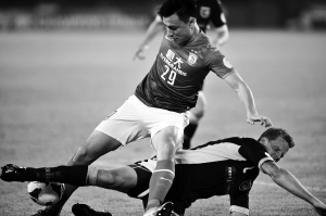 5月22日晚,2013赛季亚冠联赛1/8决赛第二回合在广州天河体育中心进行。广州恒大队3:0大胜澳大利亚中央海岸水手队,以两回合总分5:1淘汰对手挺进亚冠8强。郜林一个进球一个助攻,穆里奇造点球并打进一球,孔卡一个助攻并罚中点球。亚冠八强赛仍采用主客场制,将重新抽签决定具体对阵形势,比赛时间为9月18日。图为郜林(上)在比赛中与对手拼抢。 新华社发