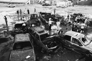 5月27日,在伊拉克首都巴格达,人们聚集在爆炸袭击地点。