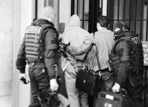 图为在法国首都巴黎,警务人员押解袭击巡逻军人的嫌疑人(左二)。