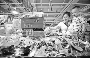 端午节临近,定安黑猪粽、儋州粽、万宁粽等各具特色的海南本地粽子逐渐热销。图为5月29日,在海口市红城湖家乐福超市,消费者选购海南本地粽子。