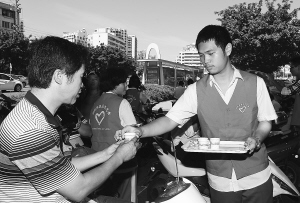 6月7日,在海南华侨中学考点外,该校一名青年志愿者为考生家长送上凉茶解暑。 本报记者 宋国强 摄