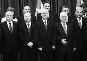 6月6日,巴勒斯坦总统阿巴斯(前右二)、巴总理拉米·哈马德(前中)和其他政府成员在约旦河西岸城市拉姆安拉出席新政府宣誓就职典礼。目前,巴勒斯坦正遭受20年以来最严重的经济危机,新政府面临严峻挑战。 新华社/路透