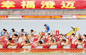 6月10日,三只龙舟在200米航道上奔驰。当日,为期两天的2013年中国龙舟公开赛(海南澄迈站)拉开帷幕。