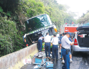 台湾嘉义县消防局表示,一辆搭载大陆浙江旅行团的游览车,上午前往阿里山地区旅游,下午在下山行经阿里山公路48.5公里处时,右侧轮胎突然滑落路旁排水沟,车辆向前滑行,直接冲撞排水沟挡土墙停止。据台湾媒体报道,台湾公路监理单位初步研判事故原因是驾驶超速。