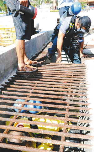 今天下午,10余名市政工人来到鹿回头广场大转盘处,清理排水涵洞内的垃圾和淤泥。由于涵洞内氧气少,还有各种有毒气体,市政工人曾雄和陈海帆都戴上了氧气罩。大约半个小时,两名市政工人从涵洞出来,他们满头大汗,衣服已经湿透。“这个四方涵洞连接大海,高约1.5米,宽2.5米,里面还有不少水,我们要不定期到这里清淤。”曾雄说。