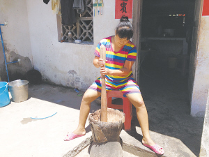 煮好的扁豆被放置于竹筐里晾干,晾干后的扁豆就会被送入钟永再家自制的臼中捶碎。这可是个体力活,用粗壮的木头反复捶打放置在臼中的扁豆,一般需要10多分钟持续不断的劳作,一颗颗扁豆才会变成扁豆泥。钟永再说,他们一直坚持手工捶打而非使用机器搅碎,最主要是因为手工出品的扁豆酱颗粒和泥状皆有,口感香醇。
