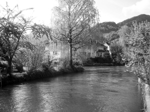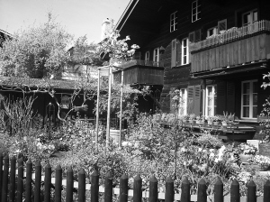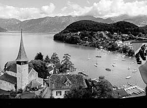 这天是星期天,街上行人很少,当我们无意中走上一座精致的桥梁时,眼前一亮!桥下,是宽阔而清亮的河面,清澈的河水滚滚流向远方,这是横穿因特拉肯市的亚拉河。因特拉肯位于布里恩茨湖与图恩湖两大湖泊之间,是湖滨之城,从阿尔卑斯山雪峰上融化流下来的雪水,进入布里恩茨湖,经过亚拉河,再流向图恩湖,四季不停。眼前,沿着河堤由近而远的,全是一栋栋形状各异的居民别墅,在蓝天青峰和繁花绿树的衬托下,犹如一幅幅水彩风情画。高耸的雪峰,奔流的河水,茂盛的花木,漂亮的别墅,令人百看不厌。对如此艳丽的花草别墅,我们一开始还认为是政府特意为小城塑造的形象工程,但当我们过桥拐入居民区后,才清楚这些都是居民的私人房屋,是他们世世代代生活的地方,优美整洁的居住环境,都是居民自己的创造与坚守。