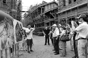 6月23日上午,香港报业公会海南岛访问团一行参观了观澜湖华谊冯小刚电影公社工地,听取项目情况介绍。 本报记者 武威 摄