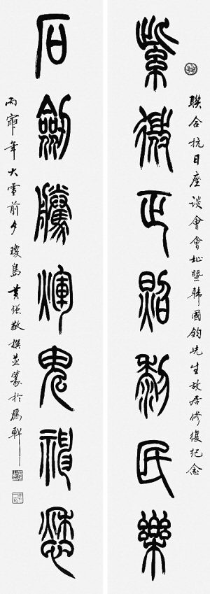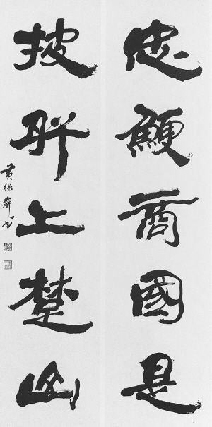 黄强深通小篆发展递变关系,以玉箸篆为入门的基本功,上溯甲骨、钟鼎金文、下探清代篆书,于吴让之小篆尤多体悟,成熟期所作小篆介于邓石如和吴让之之间,丰腴委婉。他的代表作中堂《木兰诗》,笔画刚健,结体严谨,章法整齐,庄稳雄浑,颇得玉箸篆之神韵。他自撰“紫微正照黎民乐、石剑腾辉鬼神愁”对联,字大如斗,挥运自如,观之则有遒劲丰润、委婉流畅、婀娜多姿之感,为其成熟期代表佳作,已具个人风格。