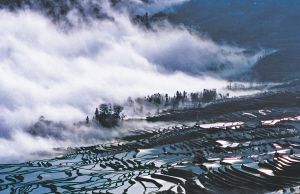 创造这一切的人或许没有觉得稀奇。这里一天分四季、十里不同天,一座山接着一座山,选择了在这里安家,就要接受这里的环境。敬畏自然的哈尼人没有移山的勇气和力量,而是随着山势地形一级级、一代代开垦田地,大的或许数亩,小的仅仅簸箕大。