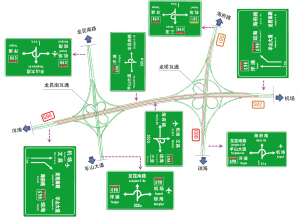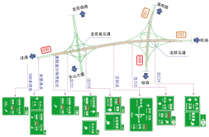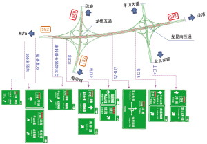 龙昆南、龙桥互通距离很近,形成6个方向交叉的复合式枢纽互通,为了让驾驶者快速准确地选择行驶方向,在每个车辆分流的关键位置指路标志采用大型图形化版面,如图8所示。