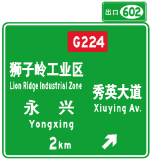 拟将狮子岭互通出口预告和出口指示标志“永兴”和“屯昌”信息改为 “狮子岭工业区”、“永兴”、“秀英大道”、“G224国道”,如图4所示。