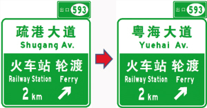 由于疏港大道更名为粤海大道,拟将粤海互通出口预告及指示标志中的“疏港大道”信息改为“粤海大道”,如图5所示。