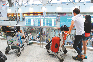 7月8日,北京地区出现雷雨天气,首都国际机场进出港航班出现大面积延误和取消。截至18时,进出港航班合计延误104架次,取消468架次。 新华社发
