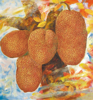 此外,椰子、菠萝蜜等海南的特色水果物产,也是黄信驹重点描摹的对象。在他的笔下,这些热带水果总是以一种浓烈饱满的形态呈现出来,色泽鲜艳耀眼,充满了骄傲和喜悦之情。黄信驹说,他描摹海南的风物,喜欢突出局部,通过对细节的描摹,来展现这些美景、果实之下所体现出的海南人的性格和精神。最近,黄信驹又创作了一组以母瑞山革命题材为内容的连环画,这是他用画笔来宣传海南文化和旅游的一次新的尝试。“是海南的水土和人民养育了我,我只有用画笔来回报。”黄信驹说,海南题材将会是他创作永远的主旋律。