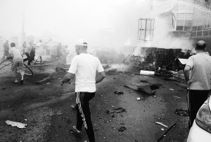 7月15日,在伊拉克首都巴格达南部的纳西里耶,人们查看爆炸现场。