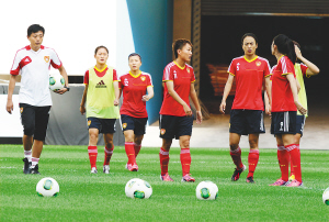 7月18日,中国女足在韩国首尔世界杯体育场训练,备战20日开始的东亚杯。图为中国女足队员在训练中。 新华社发