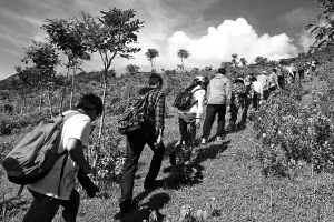 7月19日,参加暑期实践的大学生,随鹦哥岭自然保护区工作人员,攀登海拔约1030米的好汉坡。 本报记者 李英挺 摄